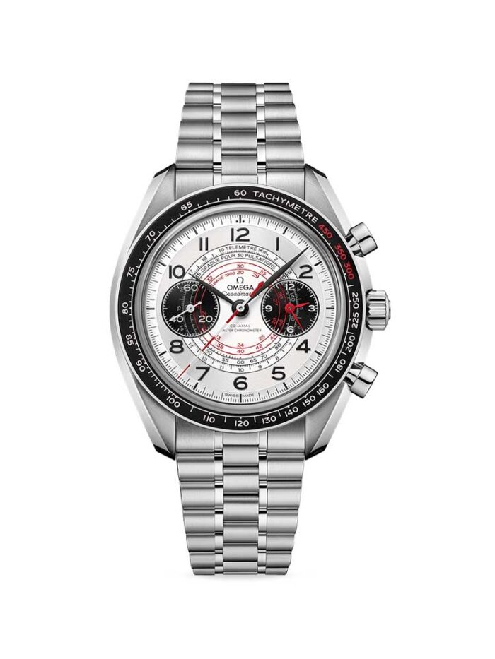 Presented on a stainless steel bracelet, the watch features a black small-seconds counter at 9H, and a black 60-minute and 12-hour recorder at 3H with red hands. Inside, the timepiece is driven by the OMEGA Co-Axial Master Chronometer Calibre 9908.